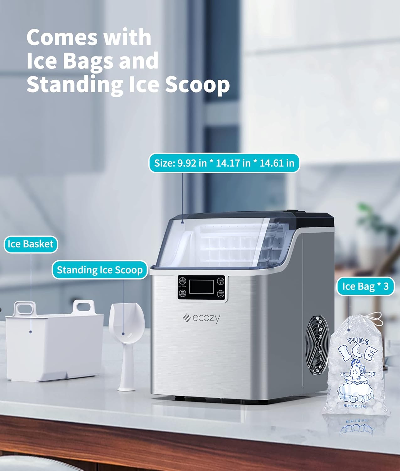 Elevate your ice game! ❄️ This Ecozy ice maker comes with everything: an ice basket, a standing ice scoop, and 3 ice bags. Sized at 9.92” * 14.17” * 14.61”, it’s a sleek, all - in - one solution for your home bar, kitchen, or party needs. Ready to make ice - prep a breeze?